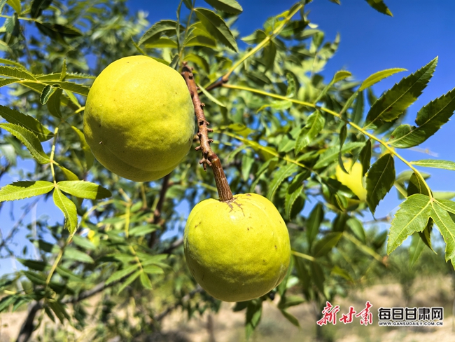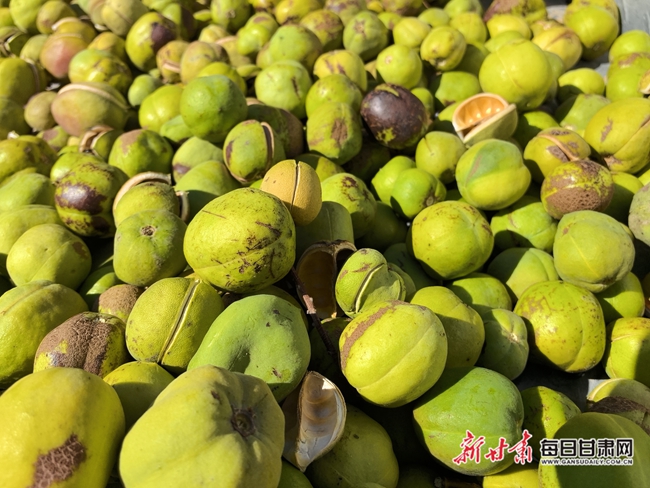 走进位于五合镇的甘肃茂群天运文冠果开发有限责任公司的万亩文冠果种植基地,饱满的果实密密匝匝缀满枝头,有的颜色尚显青绿,有的则转为褐色,黑亮的文冠果种仁藏在里面,呼之欲出。一年一度的文冠果采摘季如期而至,基地正紧锣密鼓地投入这场与时间赛跑的丰收战役。