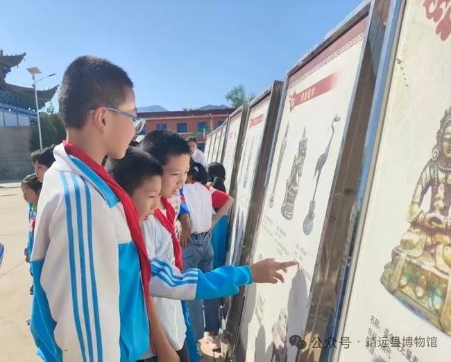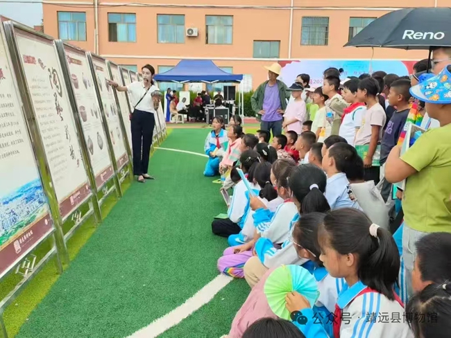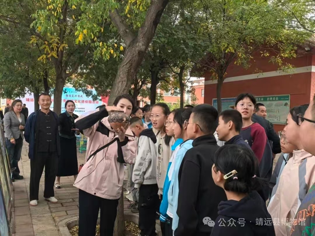 此次活动中,靖远县博物馆创新文化传播形式,将“流动博物馆”搬进了乡村校园。通过精心布置的文物展板宣讲以及沉浸式的讲解,为学生们打造了一堂生动且富有意义的本土历史文化课。流动展览的展板内容丰富多样,精选了靖远地区出土的代表性文物素材。这些文物的时间跨度极大,从新石器时代一直延伸至明清时期。展板上的彩陶、秦汉青铜兵器、明清瓷器玉器等展品,搭配着高清图片与详实的文字介绍,仿佛一部部生动的历史教科书,展现在学生们眼前。讲解员围绕这些文物,深入挖掘背后的故事,用通俗易懂的语言和生动形象的表述,让学生们在聆听中读懂文物的文化价值,感受到历史的厚重与魅力。