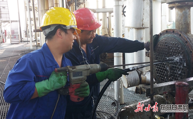 方法不管用,果断调整战术;冲击压力不足,团队的信念与担当十足。侯庆、陈为等党员突击队员主动出击,率先投入第一轮清理。他们手持沉重电钻,对准管口持续冲击,承受着强烈的设备反作用力,一根接一根地疏通堵塞物。现场钻头与垢层的摩擦声不绝于耳。为争取时间,突击队实行“人歇机不停”的轮班作业模式。尽管双手磨出水泡、胳膊酸麻,却无人叫苦喊累。夜幕下,他们挑灯夜战、愈战愈勇。一根、十根、五十根……堵塞管道被逐一疏通。最终,在苯二胺产线开车投料前,所有换热器列管全部清理完毕,他们用实际行动兑现了排除万难、保障生产的坚定承诺。(谭顺兰 刘军 邹永洪)