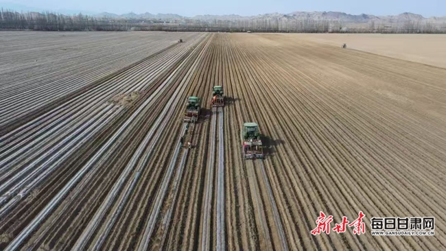 时下,景泰大地沃野平畴、生机勃发。在甘肃农垦亚盛条山分公司万亩马铃薯种植基地,两台开沟起垄机轰鸣前行,五台智能播种机同步作业,一次性完成播种、施肥、覆膜、铺设滴灌带等多道工序,北斗导航系统确保田垄笔直、垄距精准,一幅人机协同、高效作业的春播画卷徐徐展开。